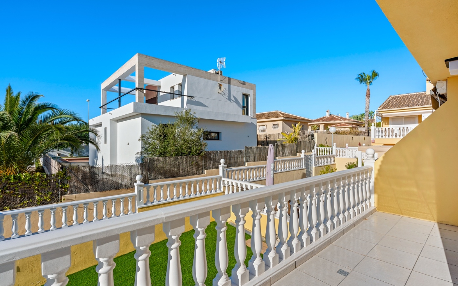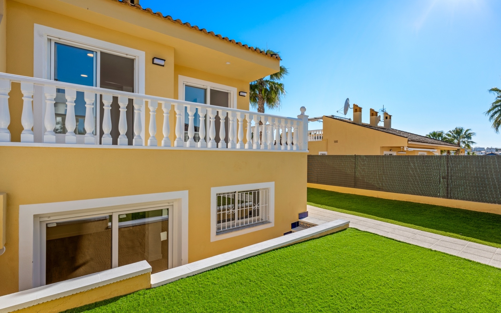 La propriété dispose d’un jardin/terrasse privé d’environ 150 m² entourant la maison, avec gazon artificiel de haute qualité et entretien minimal.