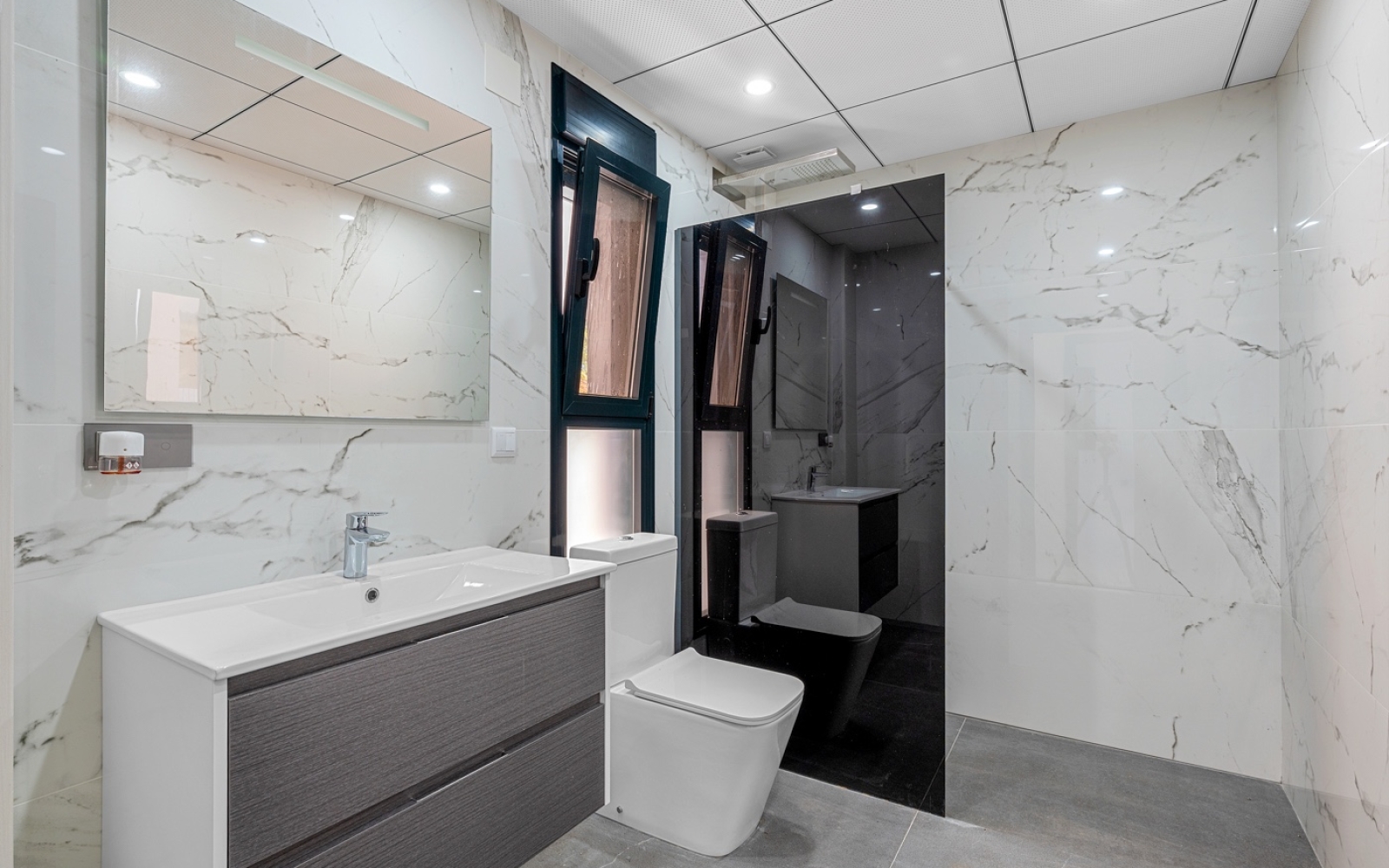 À l’entrée, on trouve un grand salon ouvert avec cuisine et de larges fenêtres offrant une abondance de lumière naturelle. Au rez-de-chaussée se trouvent également trois chambres et deux salles de bains : deux chambres et une salle de bains accessibles depuis le couloir, ainsi qu’une chambre double avec dressing et salle de bains privative.