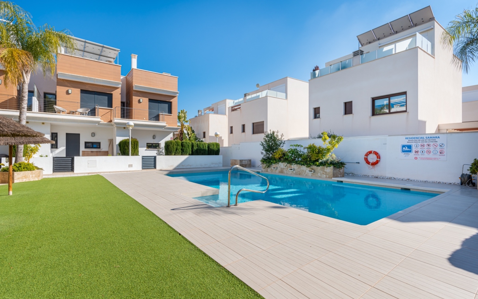 Cette charmante maison mitoyenne est située dans un quartier prestigieux de Ciudad Quesada, au sein d’une résidence fermée et tranquille offrant à ses résidents une belle piscine commune et de magnifiques espaces verts dédiés à la détente. C’est l’endroit idéal pour ceux qui souhaitent combiner confort quotidien, style méditerranéen et ambiance de vacances tout au long de l’année.