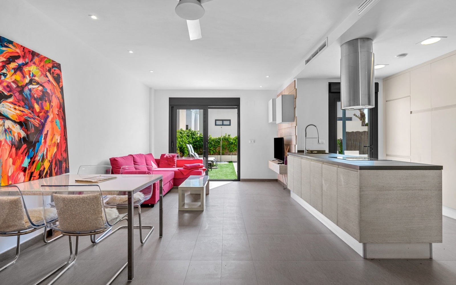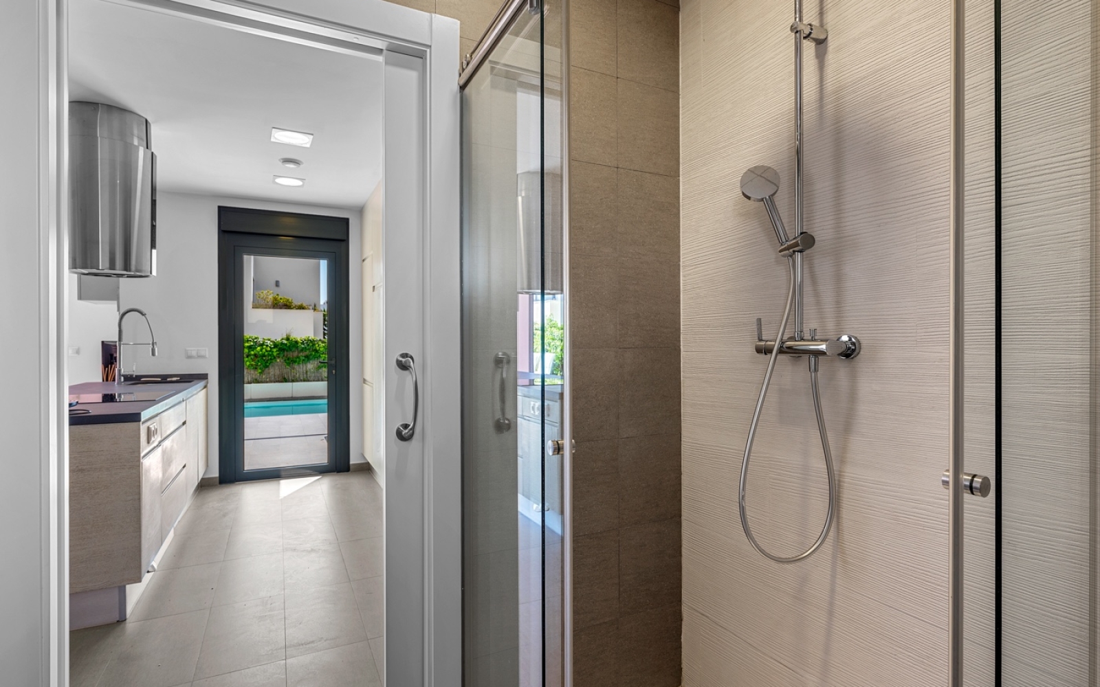 Au rez-de-chaussée, la villa offre un design moderne et fonctionnel avec une cuisine ouverte intégrée à un salon spacieux et lumineux. Un espace parfait pour la vie quotidienne et pour recevoir. Un salle de bain complète se trouve également à ce niveau.