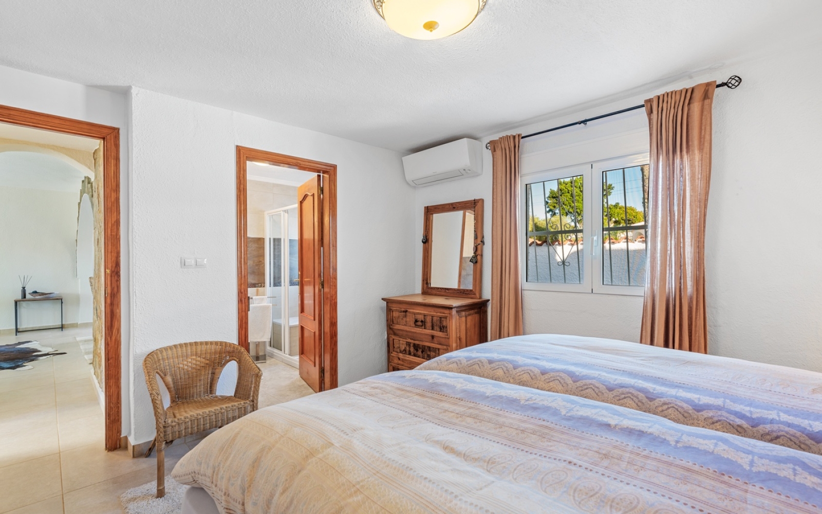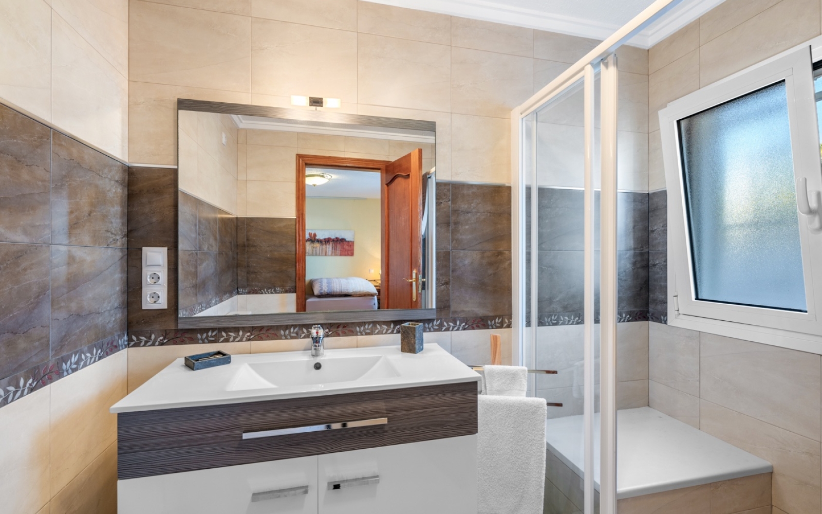 La cuisine indépendante donne directement sur l'arrière de la propriété, où se trouvent une piscine privée, une cuisine d'été et un accès au solarium – idéal pour profiter pleinement du style de vie méditerranéen. Depuis la cuisine, on accède également directement au garage intérieur et à un espace polyvalent situé en dessous. Cet espace peut être aménagé en chambre supplémentaire, en espace de vie ou de divertissement, ou encore en studio/bureau confortable.