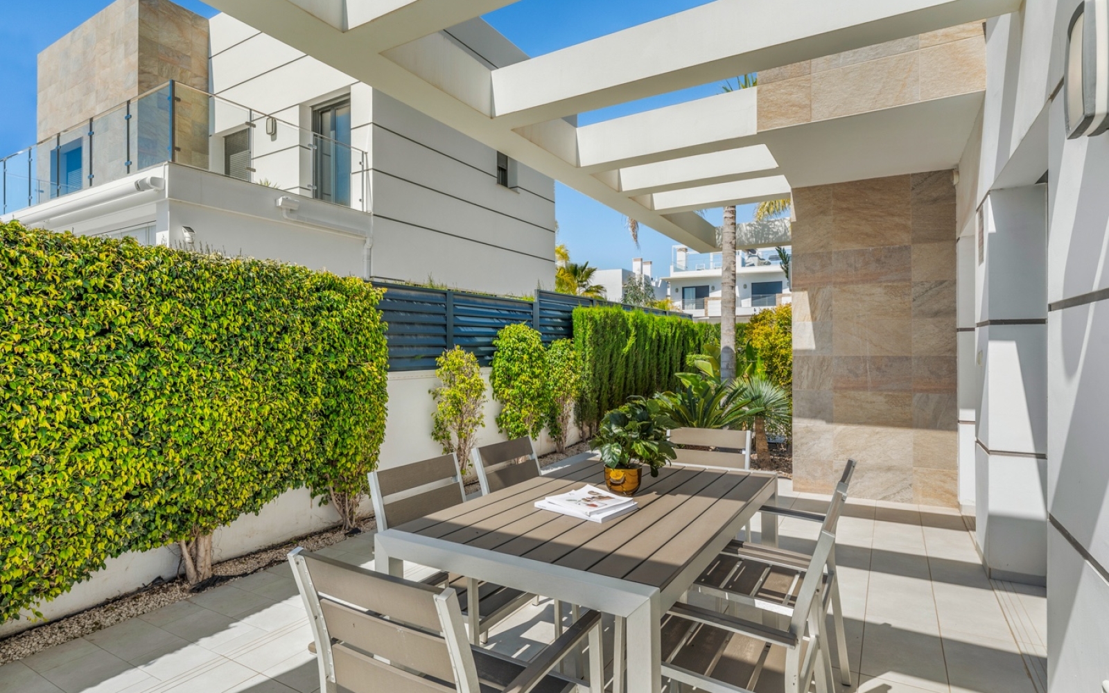 La villa est équipée de la climatisation centralisée (chaud/froid), du chauffage au sol dans toutes les salles de bains, de fenêtres à double vitrage et d’une porte d’entrée sécurisée. Elle dispose également d’un éclairage LED intégré élégant dans le salon et dans deux des chambres.