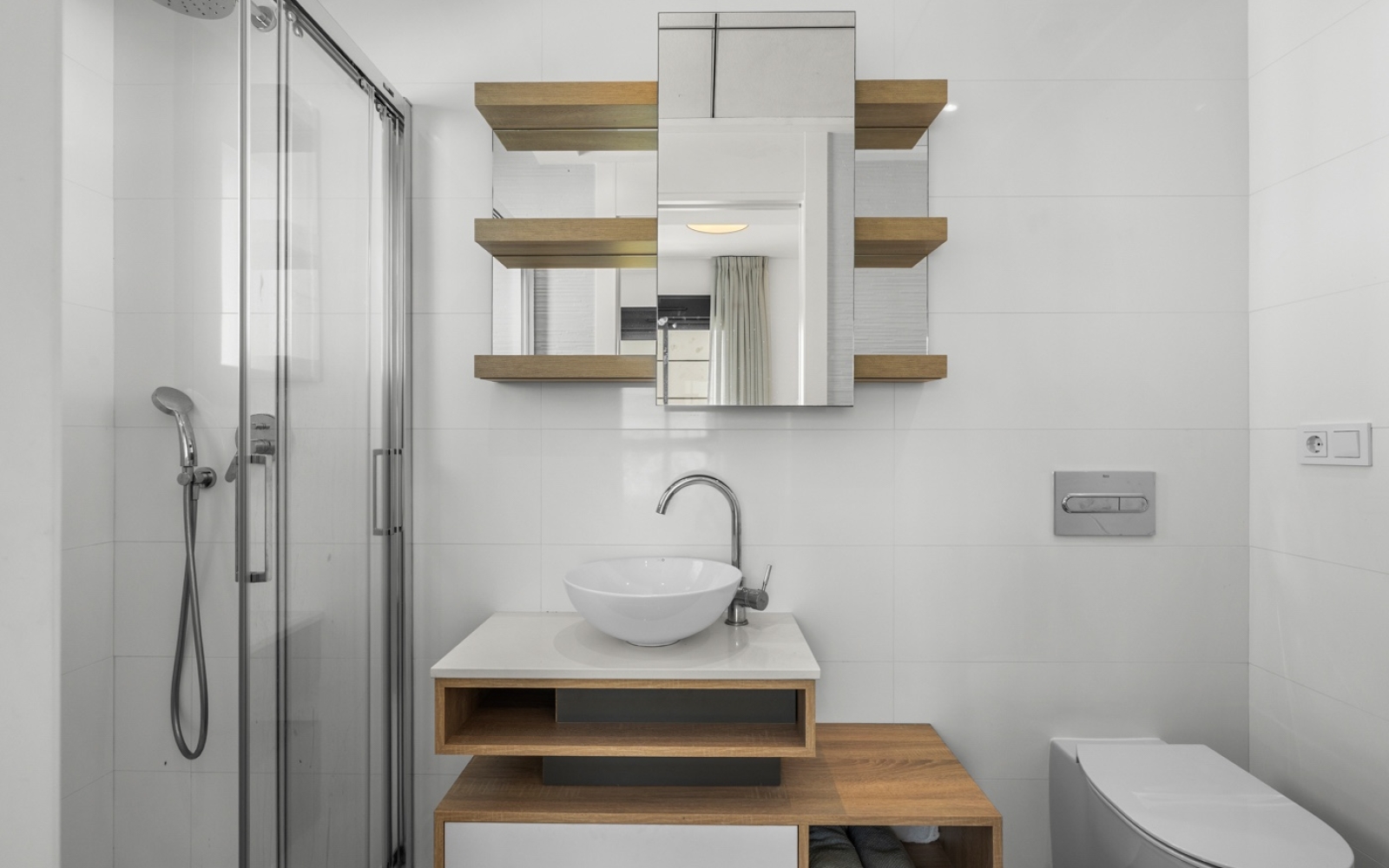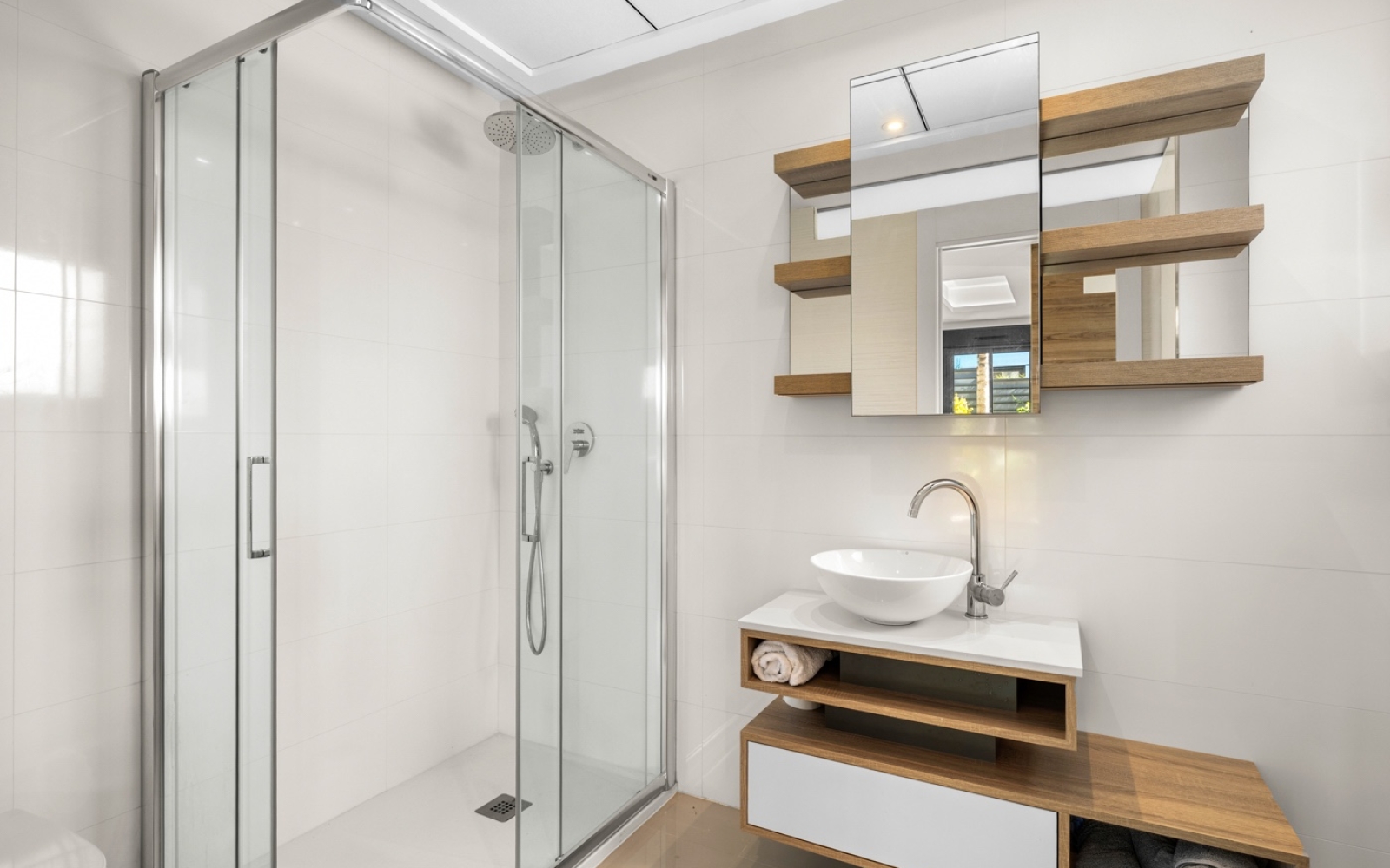 À l’étage, deux chambres disposent chacune de leur salle de bains en suite. La chambre principale comprend un dressing, tandis que les autres chambres sont équipées de placards intégrés. Depuis cet étage, vous accédez à une grande terrasse menant à un spacieux solarium sur le toit.
