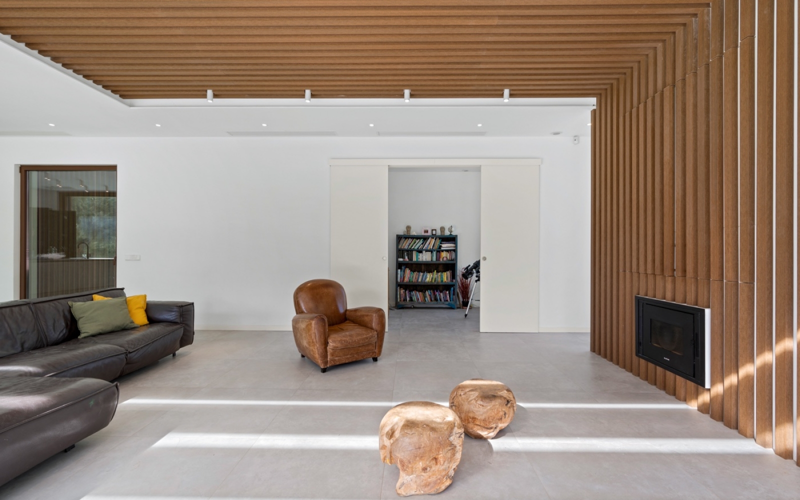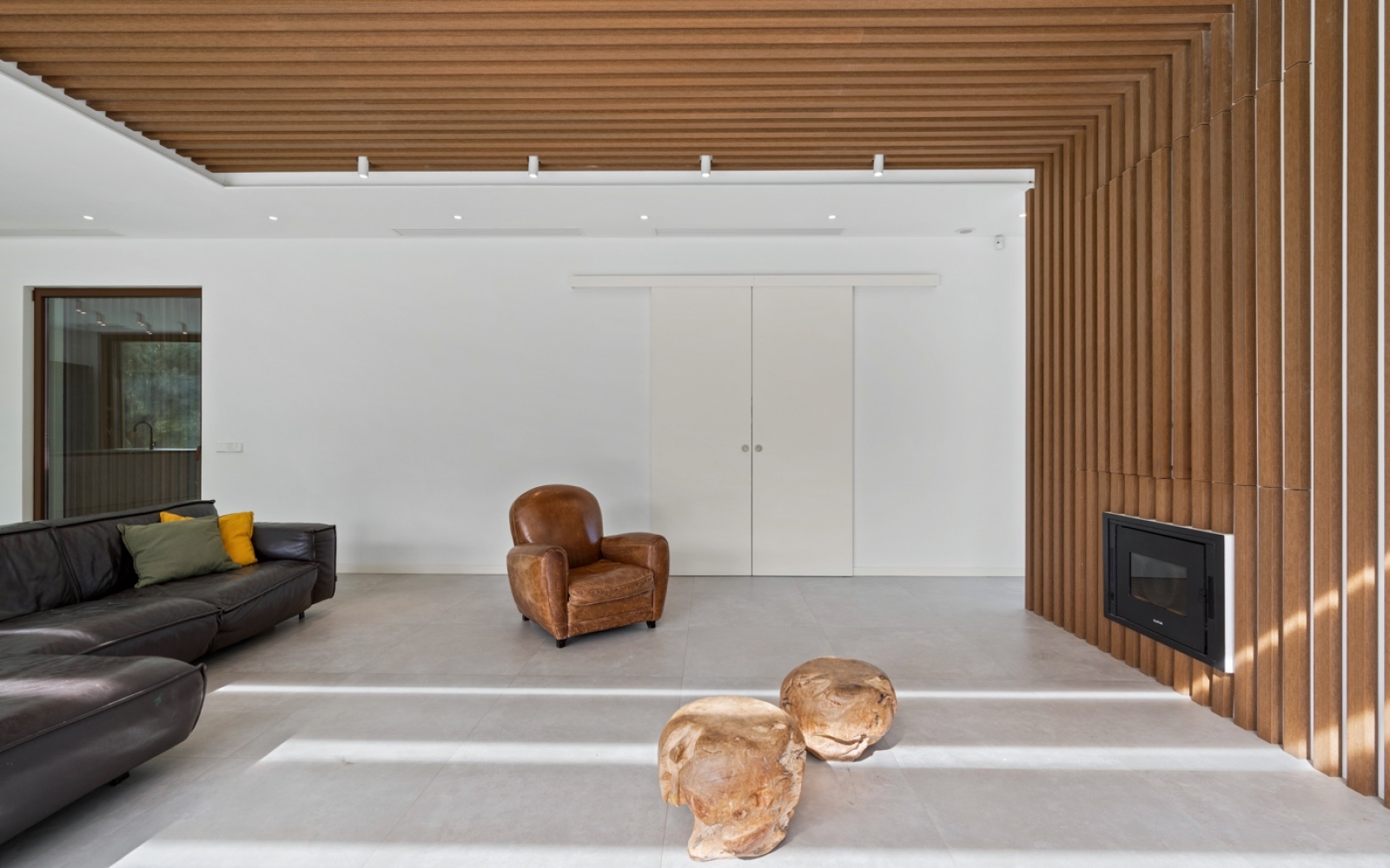 À l’intérieur, le temps ralentit. Un vaste salon-salle à manger pour de longues conversations, des rires ou simplement admirer la nature à travers les grandes baies vitrées. À côté de la télévision dissimulée et de la cheminée prête pour l’hiver, des portes coulissantes mènent à une pièce conçue pour devenir votre espace de lecture, bureau, coin détente ou refuge créatif.