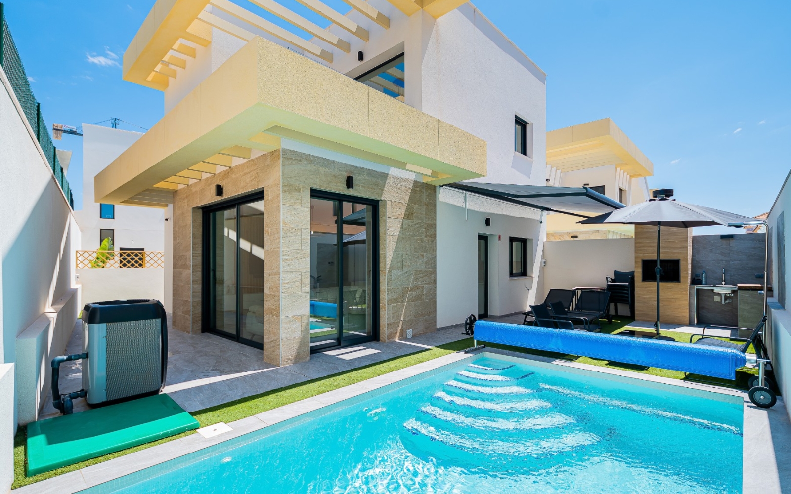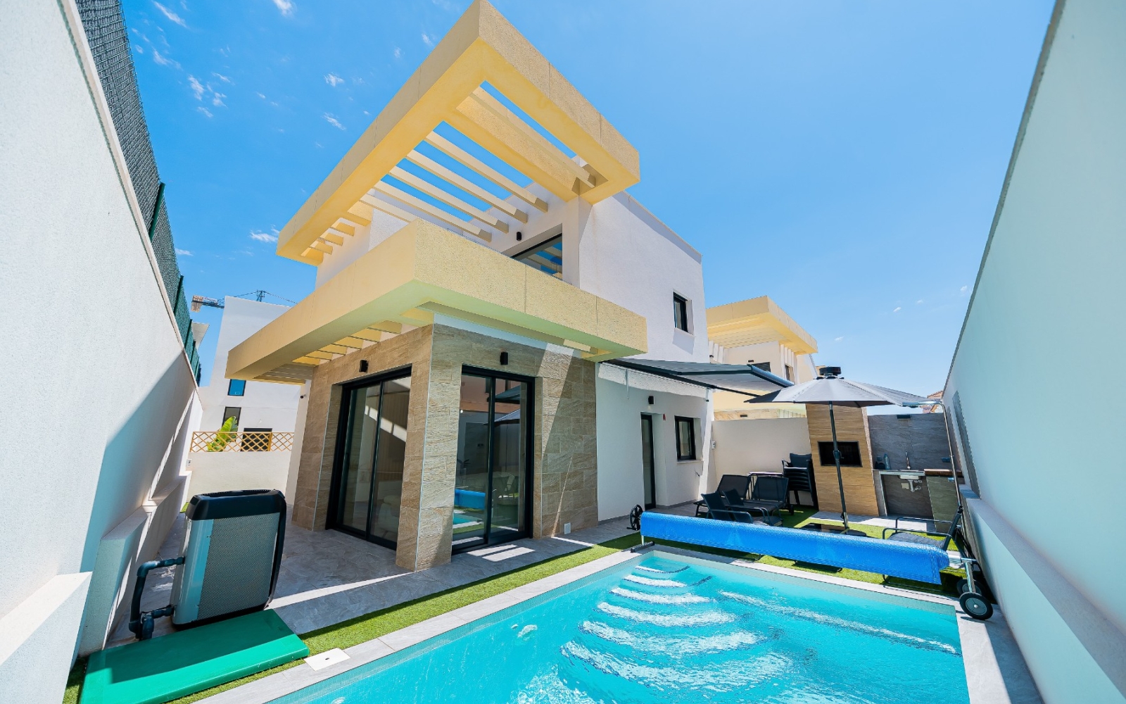 Découvrez cette spectaculaire villa individuelle au design contemporain, construite il y a seulement 3 ans, située dans un quartier résidentiel calme à quelques minutes du charmant village de Los Montesinos, sur la Costa Blanca. Cette maison allie confort, efficacité énergétique et espaces conçus pour profiter pleinement du style de vie méditerranéen.