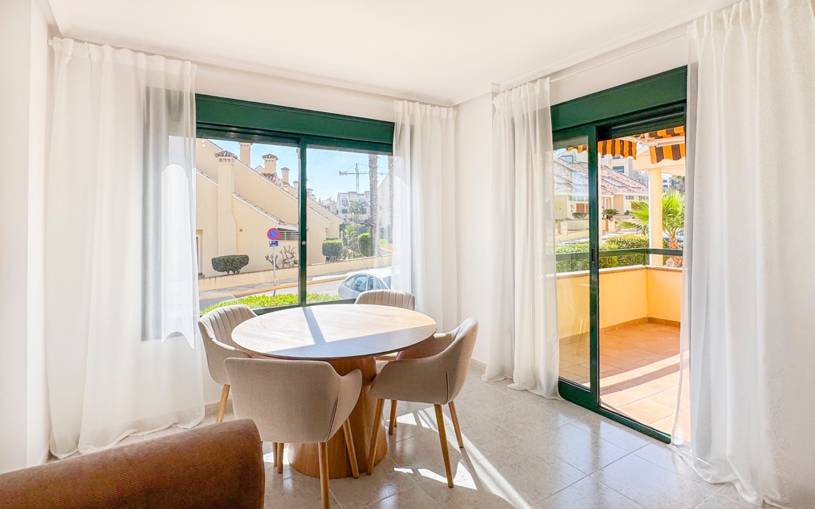 Appartement en rez-de-chaussée surélevé situé à Lomas de Campoamor, un quartier résidentiel proche des terrains de golf et des services. Orienté plein sud, il offre des vues dégagées et une bonne luminosité.