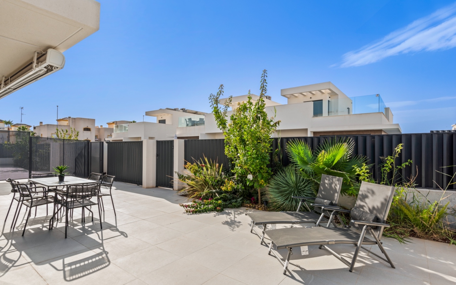 Maison jumelée moderne (semi-adosado) située dans un quartier calme de San Fulgencio, sur un terrain avec piscine privée et espace extérieur dédié à la détente. La propriété a été conçue pour que le jardin soit le prolongement naturel de l’espace de vie — de grandes baies vitrées apportent beaucoup de lumière naturelle et créent des pièces lumineuses, spacieuses et ouvertes sur l’extérieur.