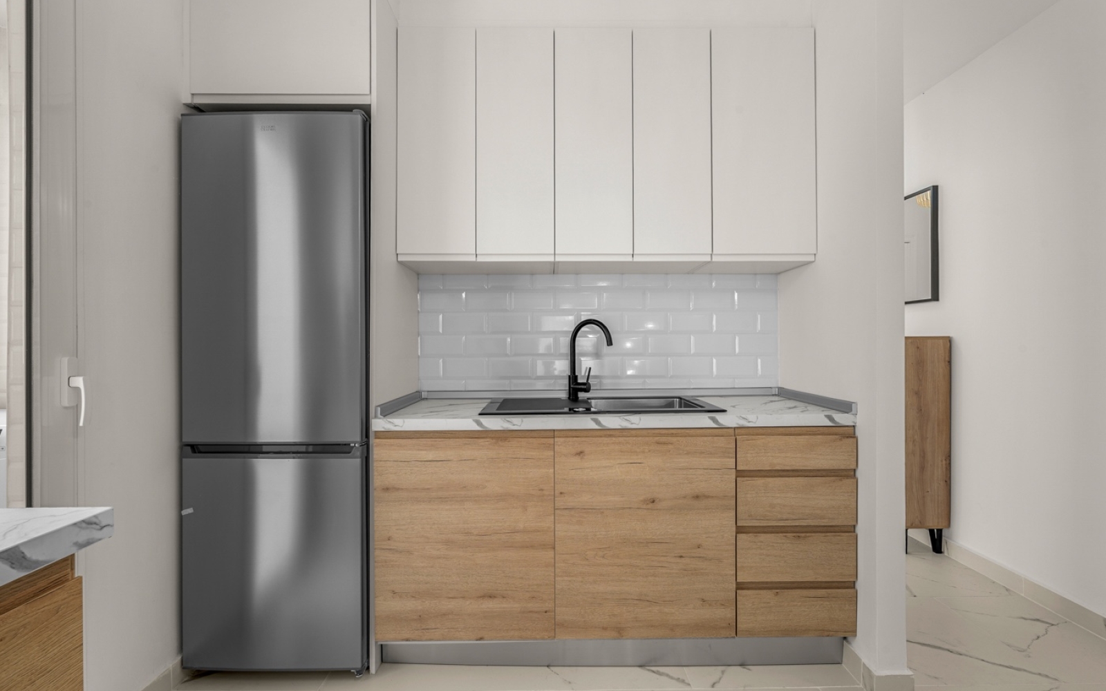 La cuisine moderne et entièrement équipée donne accès à un agréable patio intérieur où se trouve la buanderie.