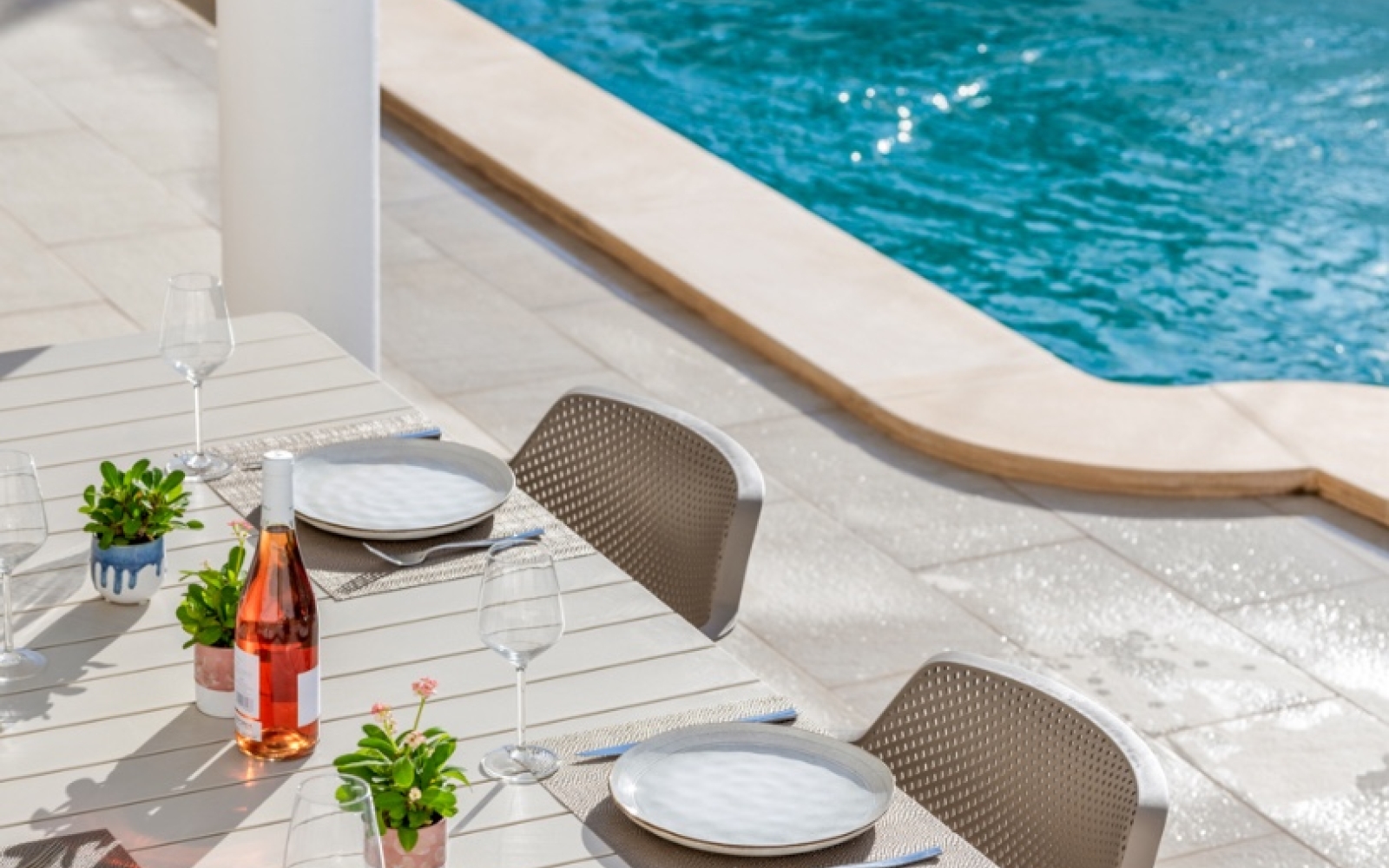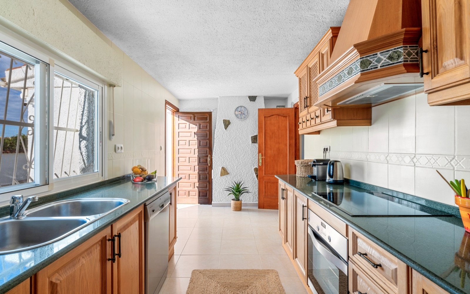 La cuisine indépendante donne directement sur l'arrière de la propriété, où se trouvent une piscine privée, une cuisine d'été et un accès au solarium – idéal pour profiter pleinement du style de vie méditerranéen. Depuis la cuisine, on accède également directement au garage intérieur et à un espace polyvalent situé en dessous. Cet espace peut être aménagé en chambre supplémentaire, en espace de vie ou de divertissement, ou encore en studio/bureau confortable.