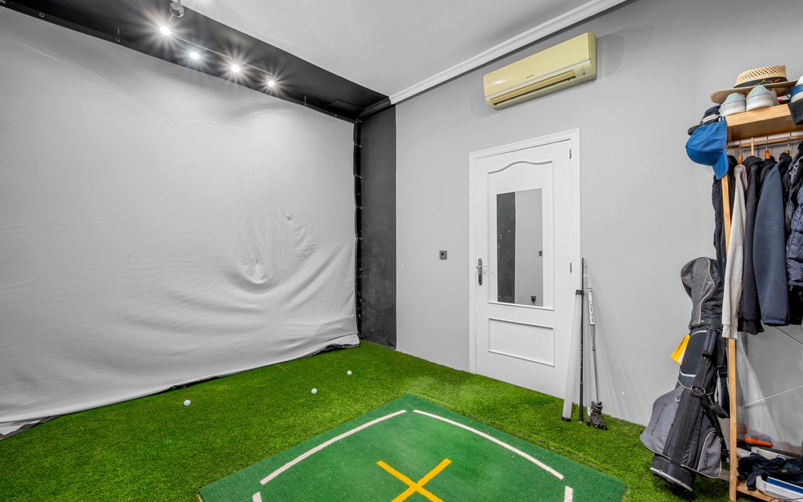 Grand séjour principal avec un espace bureau idéal pour le télétravail et une élégante salle de golf privée pour les sportifs.
