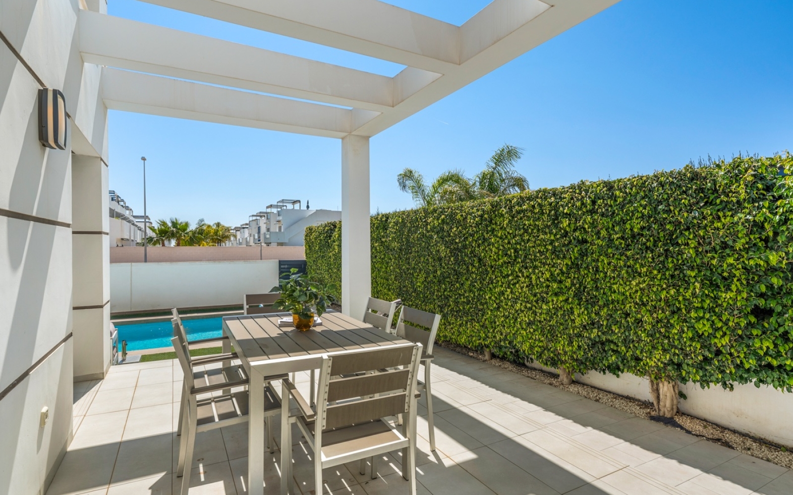 La villa est équipée de la climatisation centralisée (chaud/froid), du chauffage au sol dans toutes les salles de bains, de fenêtres à double vitrage et d’une porte d’entrée sécurisée. Elle dispose également d’un éclairage LED intégré élégant dans le salon et dans deux des chambres.