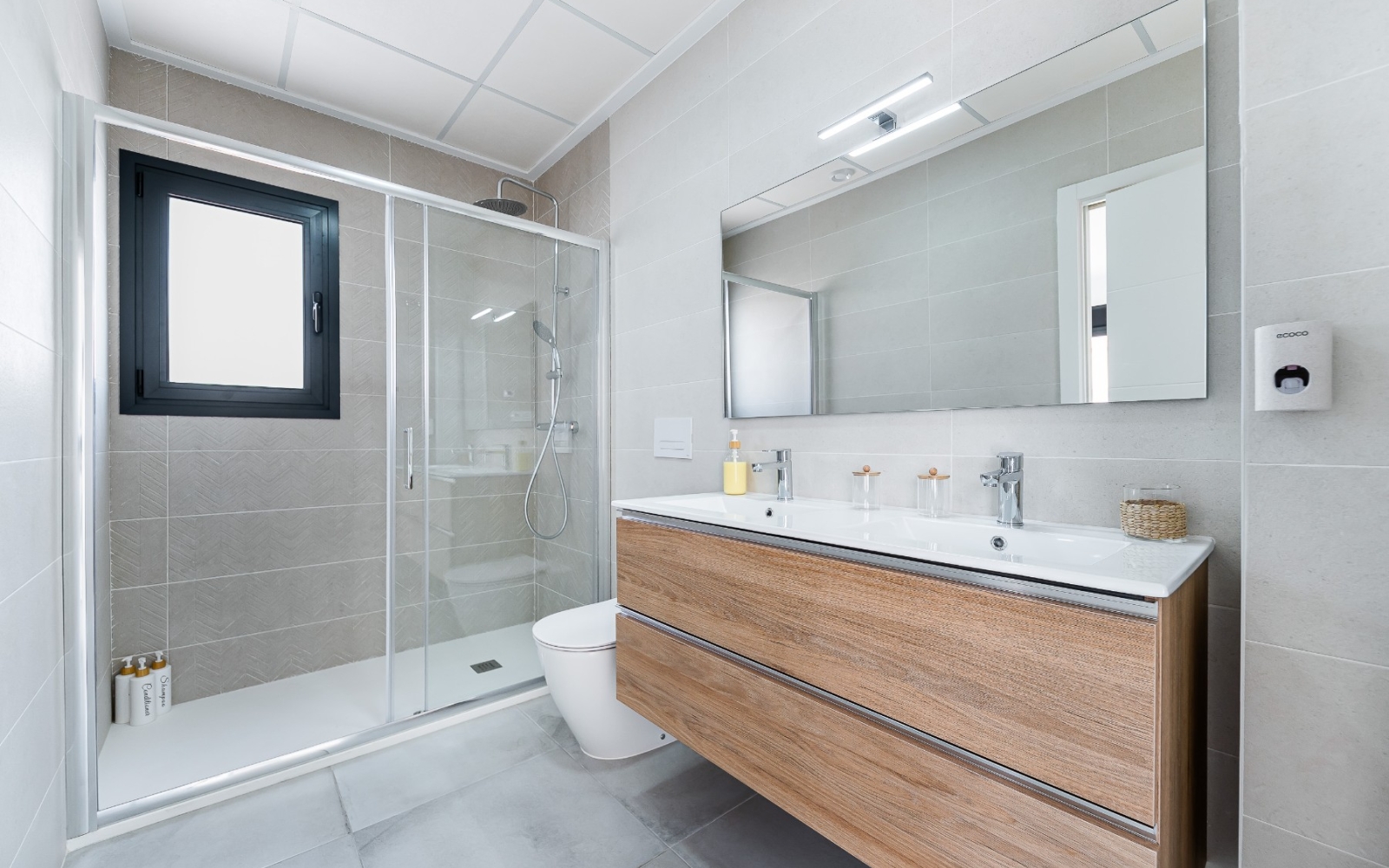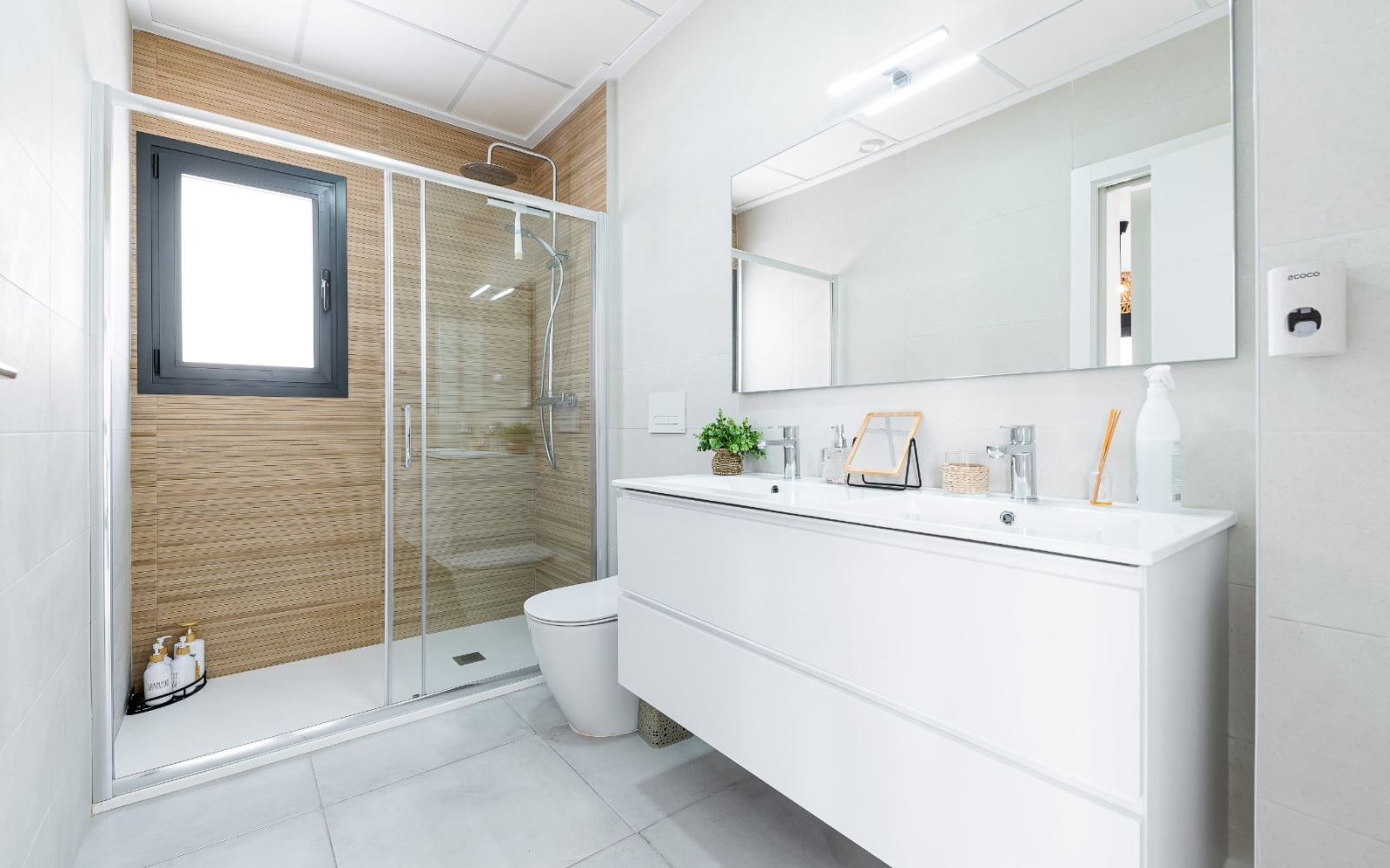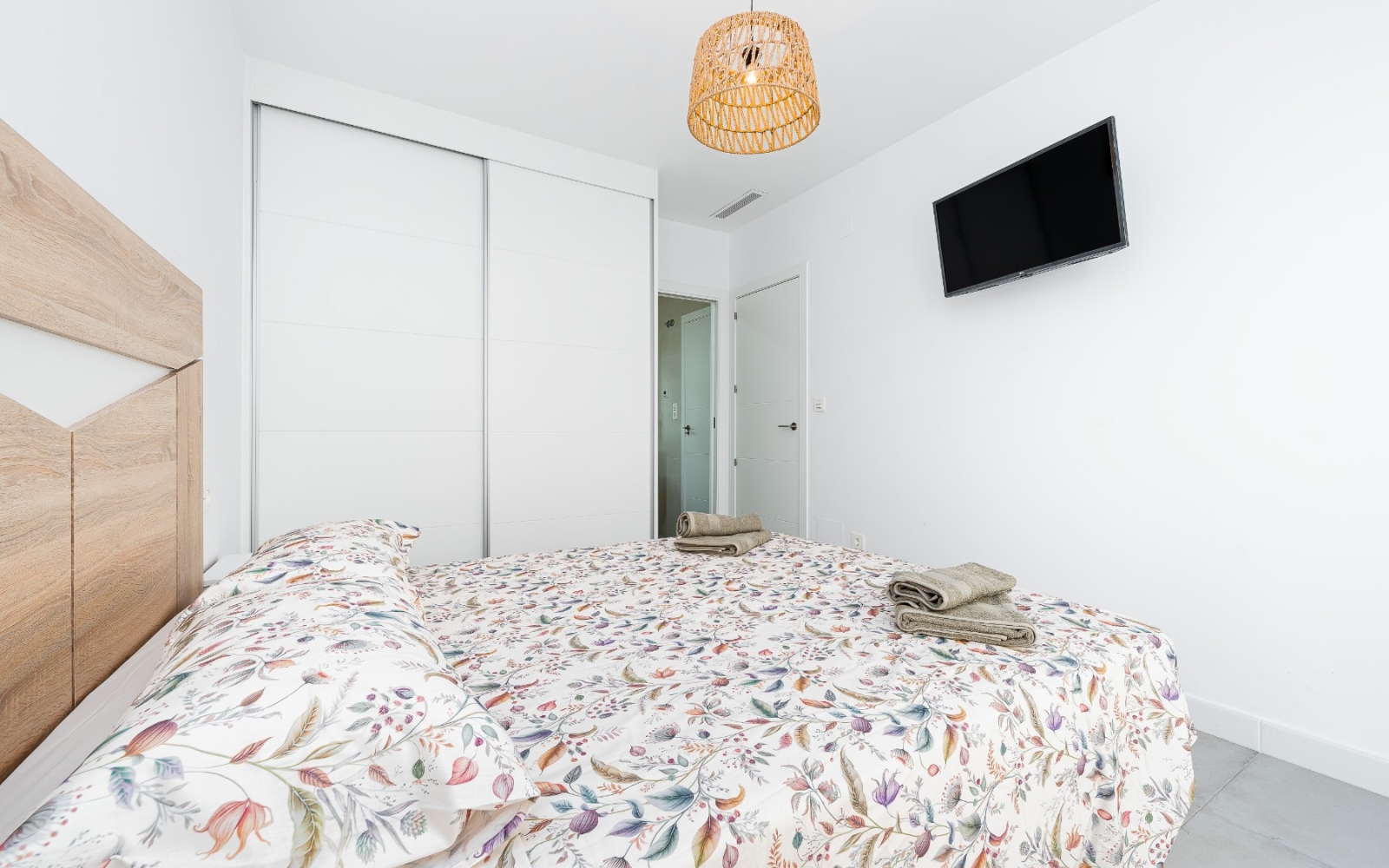 La propriété comprend 3 chambres spacieuses et 2 salles de bain complètes, toutes deux accessibles par un double accès (depuis le couloir et depuis la chambre), pour plus de commodité et d'intimité. De plus, les deux salles de bain sont équipées d'un chauffage au sol, idéal pour un confort optimal toute l'année.