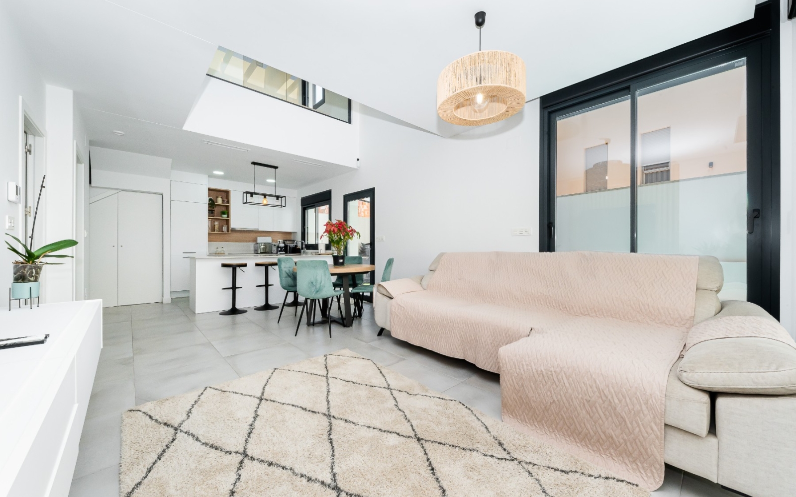 Le cœur de la maison est son salon lumineux avec un haut plafond, créant une impressionnante sensation d'espace. De grandes fenêtres laissent entrer une abondante lumière naturelle, reliant harmonieusement l'intérieur et l'extérieur. La cuisine moderne et entièrement équipée offre à la fois fonctionnalité et style, parfaite pour un usage quotidien et pour recevoir des invités.