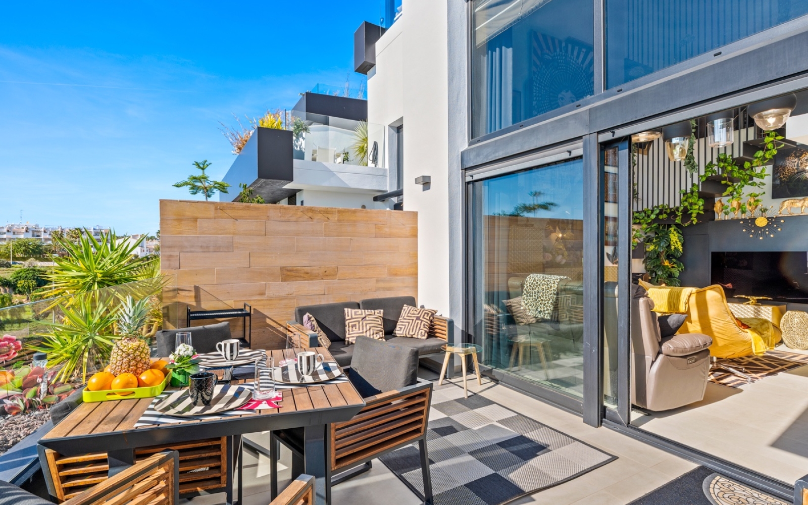 Depuis le salon, une porte donne sur une grande terrasse, idéale pour les repas en plein air. À l'étage, vous découvrirez une terrasse supplémentaire avec cuisine extérieure, barbecue et table à manger, parfaite pour savourer un repas dans un cadre exceptionnel tout en admirant la vue spectaculaire.