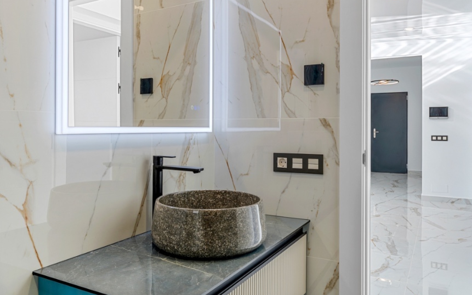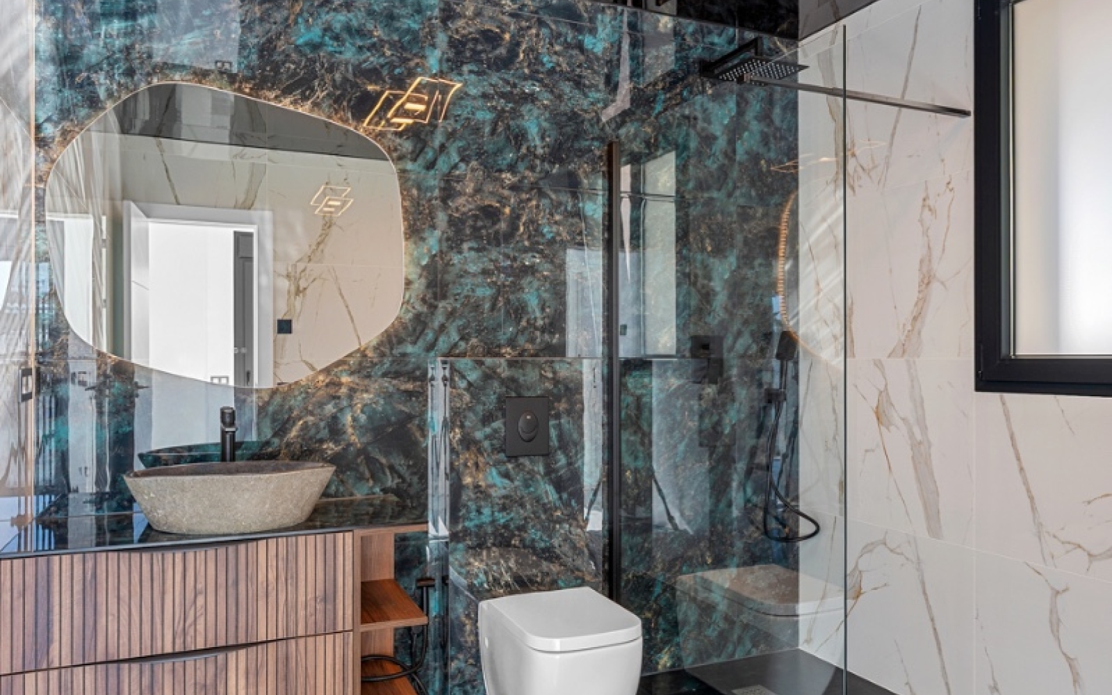 4 salles de bains design, dont 3 attenantes, équipées de matériaux de luxe et d'une esthétique moderne impeccable.