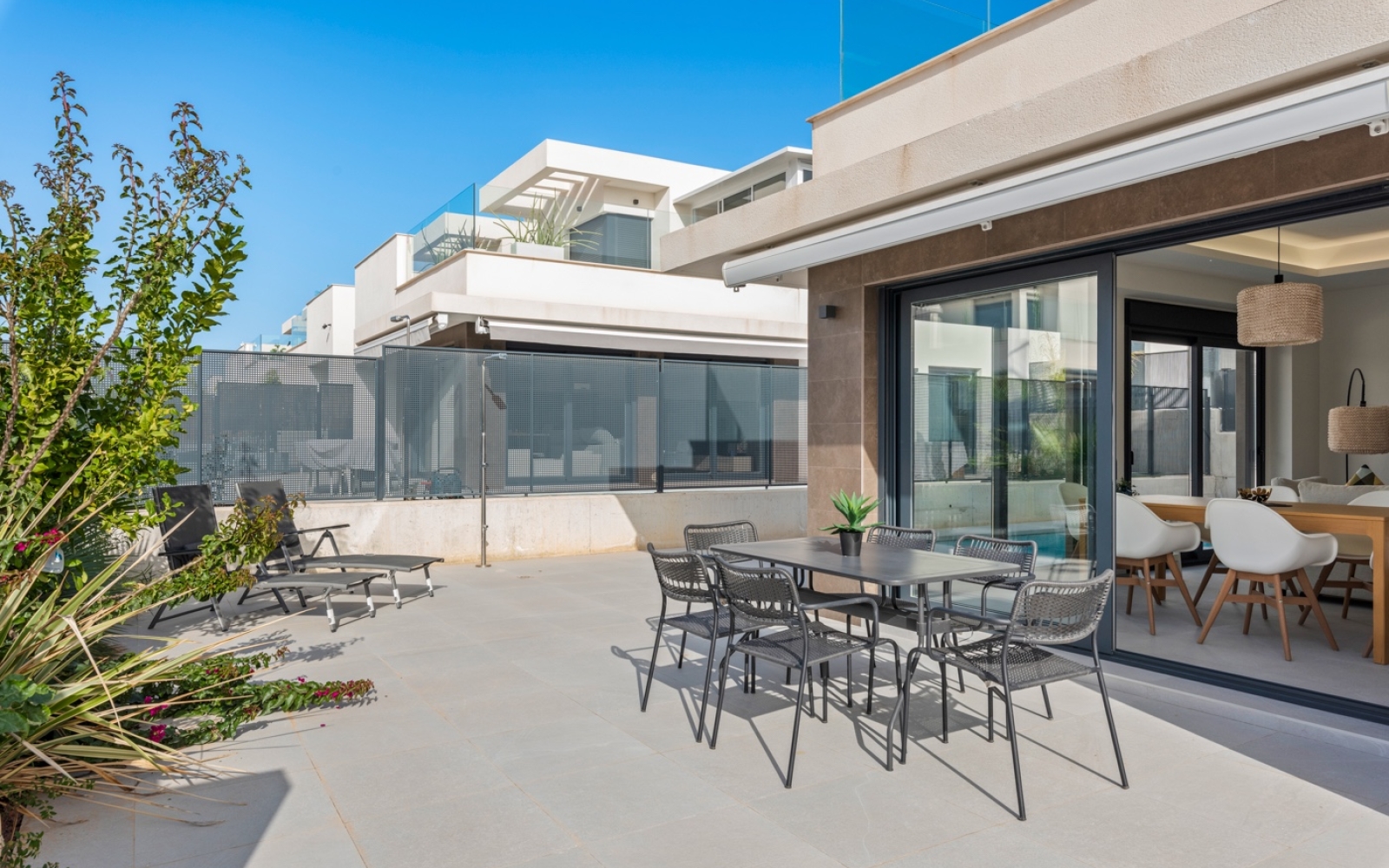 Maison jumelée moderne (semi-adosado) située dans un quartier calme de San Fulgencio, sur un terrain avec piscine privée et espace extérieur dédié à la détente. La propriété a été conçue pour que le jardin soit le prolongement naturel de l’espace de vie — de grandes baies vitrées apportent beaucoup de lumière naturelle et créent des pièces lumineuses, spacieuses et ouvertes sur l’extérieur.